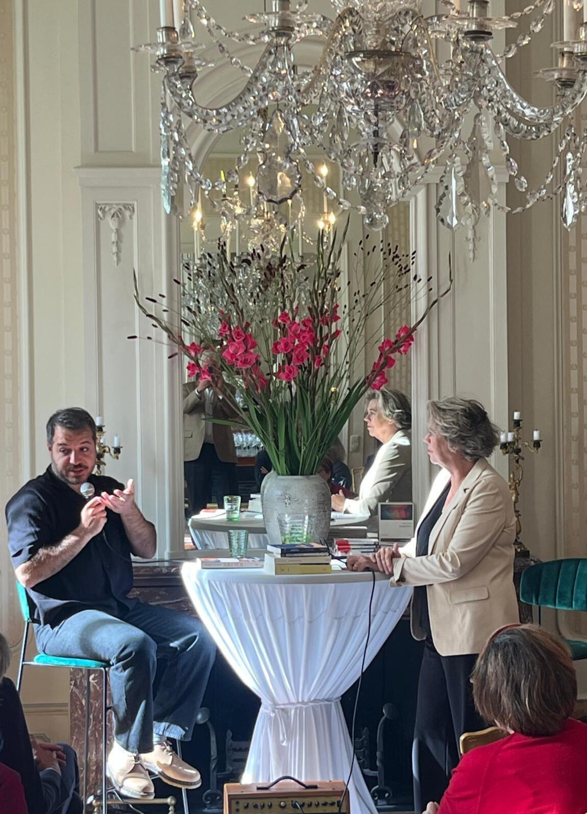 Avant-première, ontmoeting met Jean-Baptiste Andrea, winnaar van de prix Goncourt 2023 voor zijn roman “Veiller sur elle” (verschenen bij L’Iconoclaste). De Salon Littéraire kreeg een vliegende start met de komst van de Goncourtwinnaar die een paar uur in Amsterdam was en door Margot Dijkgraaf werd geïnterviewd over zijn bekroonde roman. Uitgeverij Oevers gaf acte de présence met de Nederlandse vertaling Waak over haar, vertaald door Martine Woudt.